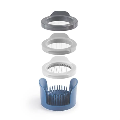 En plastique et acier inoxydable, cet ustensile bleu et gris prend peu de place dans vos placards car les trancheurs s’empilent les uns sur les autres dans le réceptacle.