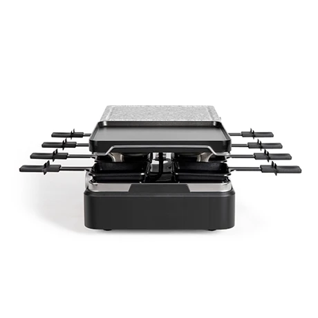 Créez une ambiance vacances aux sports d’hiver avec cet appareil à raclette 8 personnes 1400 W muni de 8 caquelons et 8 spatules bois. Bien stable grâce à ses pieds antidérapants, cet appareil est idéal pour une soirée décontractée entre amis et très pratique grâce à ses deux plateaux de 23 cm x 21 cm en pierre fonte d’aluminium antiadhésive.