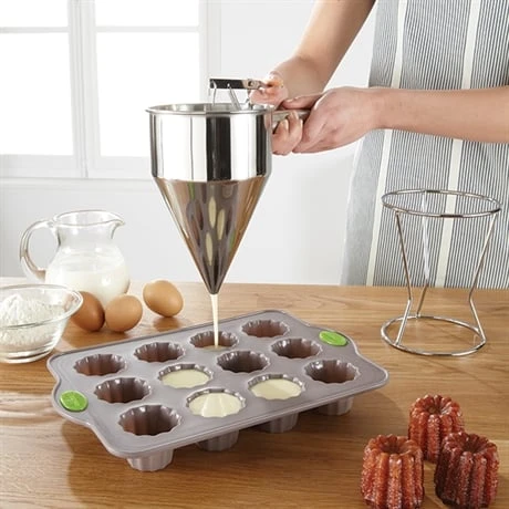 L’entonnoir à piston en inox permet de remplir proprement votre poêle en faisant couler la quantité idéale dans vos empreintes. Une simple pression du pouce suffit pour ouvrir l’entonnoir ; vous maitrisez donc facilement le débit pour ajuster la quantité que vous souhaitez faire couler.