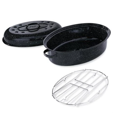 En céramique Graniteware, le roaster vous permet de cuire, sur la flamme ou au four, vos rôtis et volailles. Son couvercle à picot assure un arrosage permanent des aliments, pour un résultat moelleux et savoureux. Il est idéal pour les grosses volailles et les pièces de viandes. Le roaster est made in USA