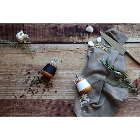 La version poivrière est identique avec le cuir grainé noir. Ce duo de mini moulins Ogo sera du plus grand effet sur votre table.