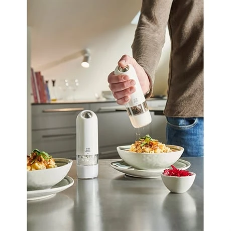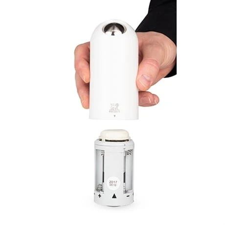 Design résolument contemporain pour ce moulin à sel Alaska 17 cm à la fois ludique et vintage, avec sa forme galbée et son bouton tout en rondeur. En plastique et métal pour un mélange harmonieux et ergonomique. Ingénieux : s’utilise d’une seule main, une lampe à la base permet de contrôler le dosage, et un réservoir transparent indique le niveau de remplissage.