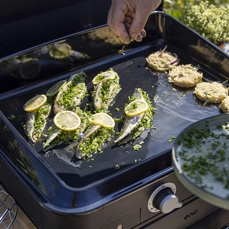 La Combo 65 a une finition raffinée qui s’intégrera aux plus jolis environnements outdoor. Elle présente aussi des fonctionnalités bien pensées : un allumeur électronique intégré aux manettes, un récupérateur de jus avec indicateur de niveau, deux roues tout-terrain complétées de deux roulettes pivotantes avec frein pour déplacer la plancha et des pieds réglables antidérapants pour assurer sa stabilité.